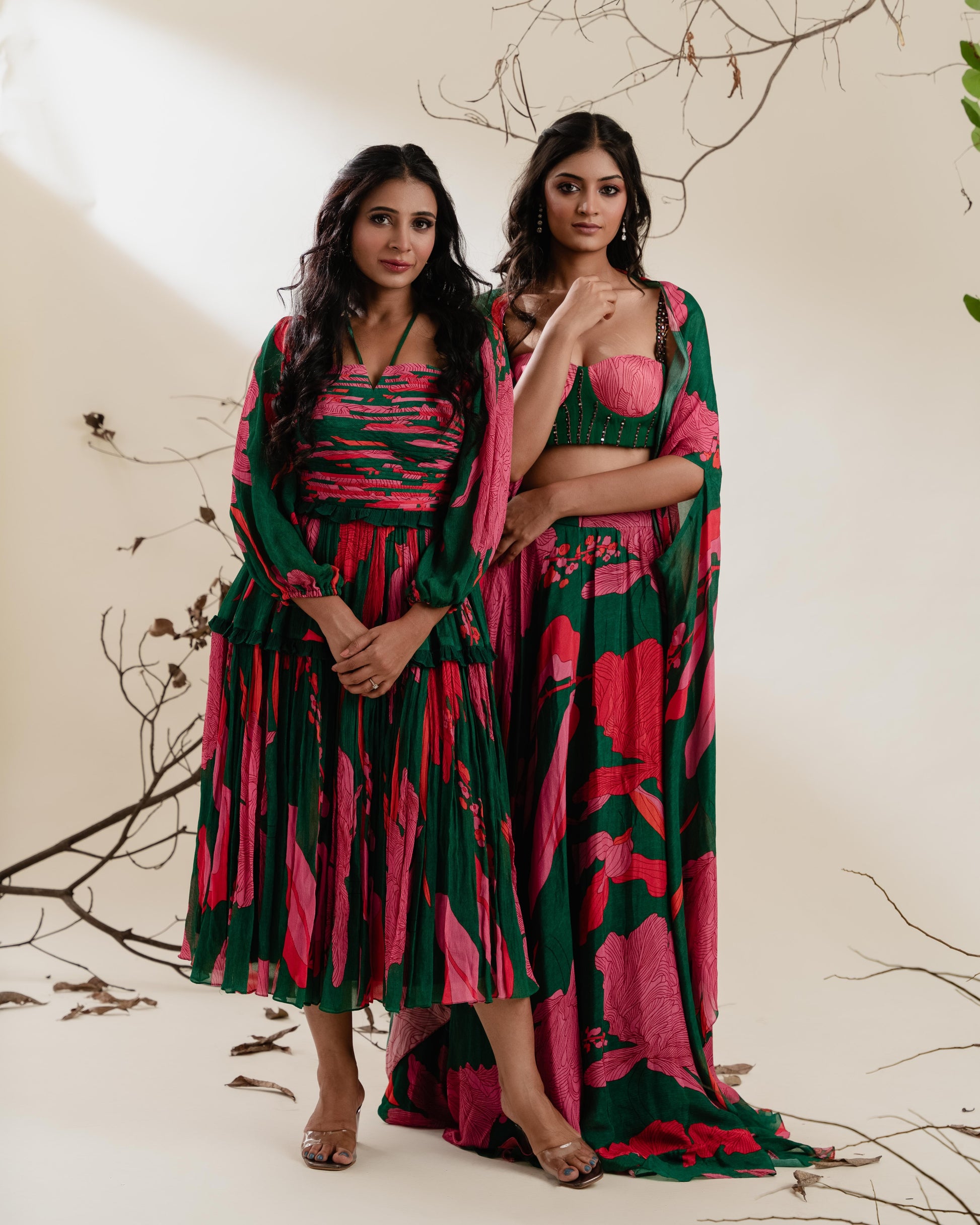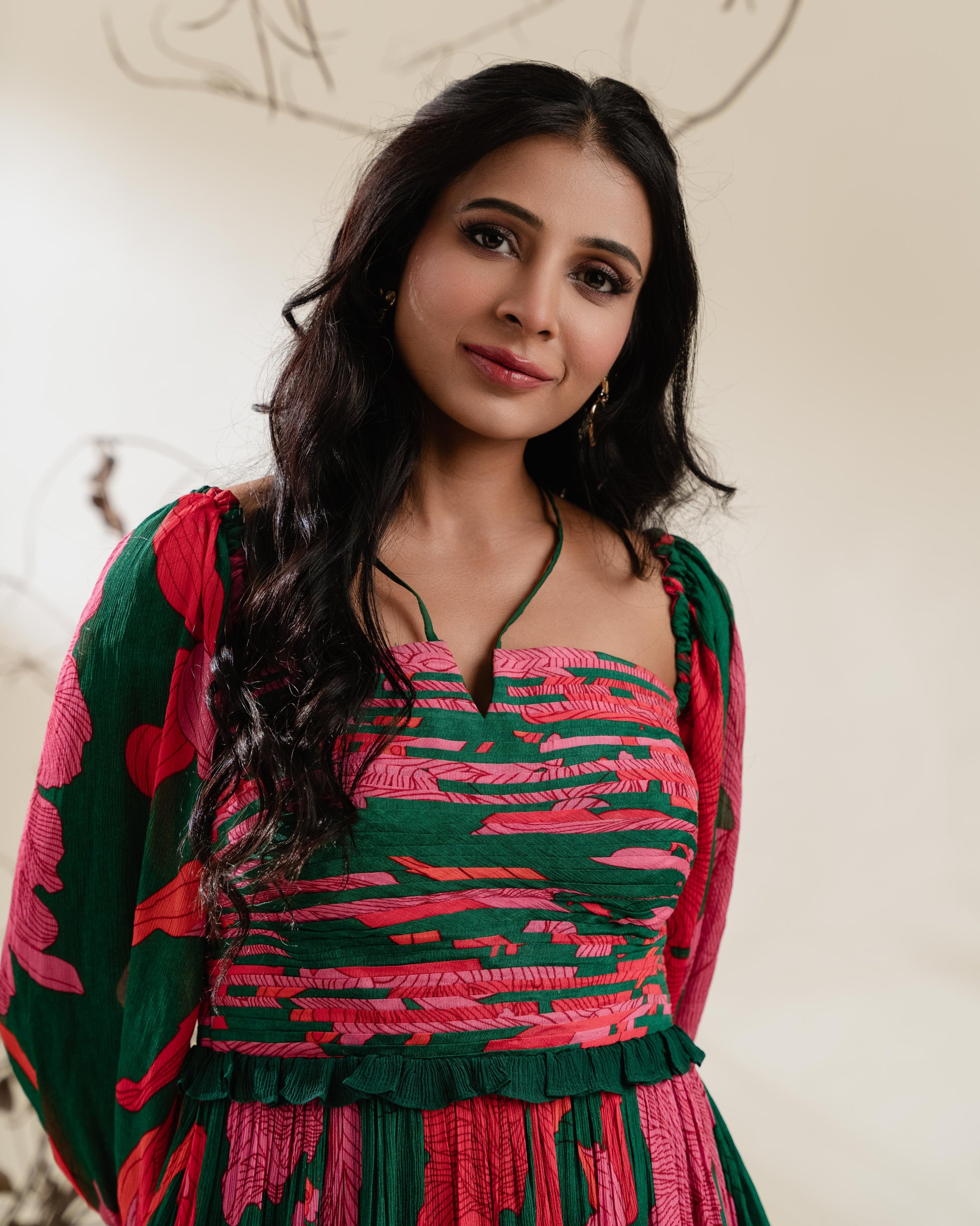 A flowy statement piece designed to move with you. Crafted in soft chinon chiffon, this midi dress features a rich floral print in deep green, hot pink, and crimson. The ruched bodice contours the upper torso for a flattering fit, finished with delicate halter neck straps that frame the neckline.Three-quarter blouson sleeves add gentle drama with gathered detailing at the shoulders and elasticated cuffs. Effortlessly elegant, this dress is perfect for brunches, resort getaways, or evening cocktails.